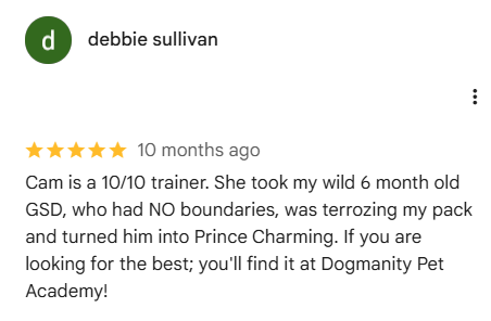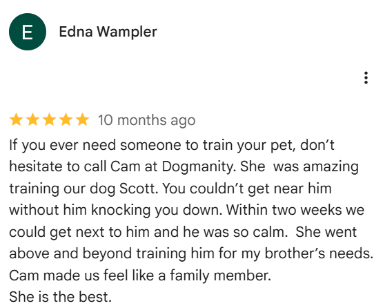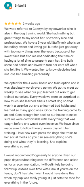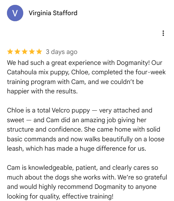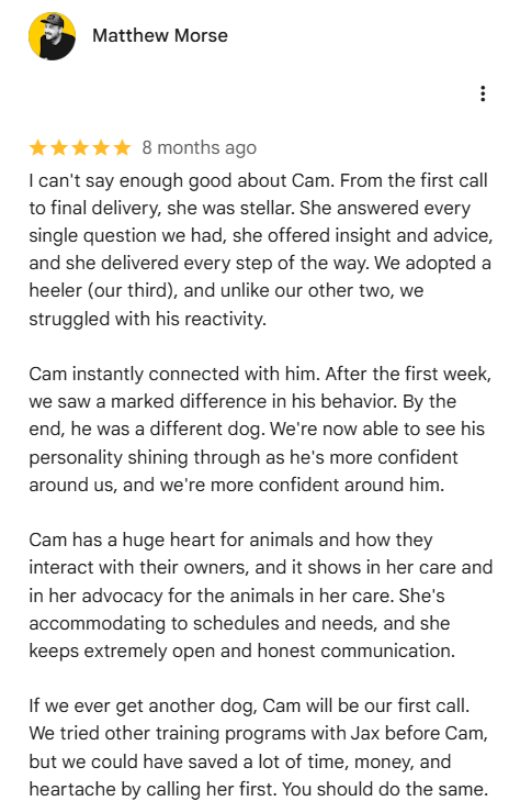 Camryn will schedule a meet-and-greet with you and your dog to evaluate your dog’s behavior, temperament, and training goals. From there, she’ll recommend the program that best fits your dog’s needs.