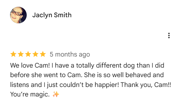 Click “BOOK NOW” and fill out the form with your dog’s information. Once we receive your submission, our team will reach out within 30 minutes to schedule your free phone consultation with Camryn and go over everything in detail.